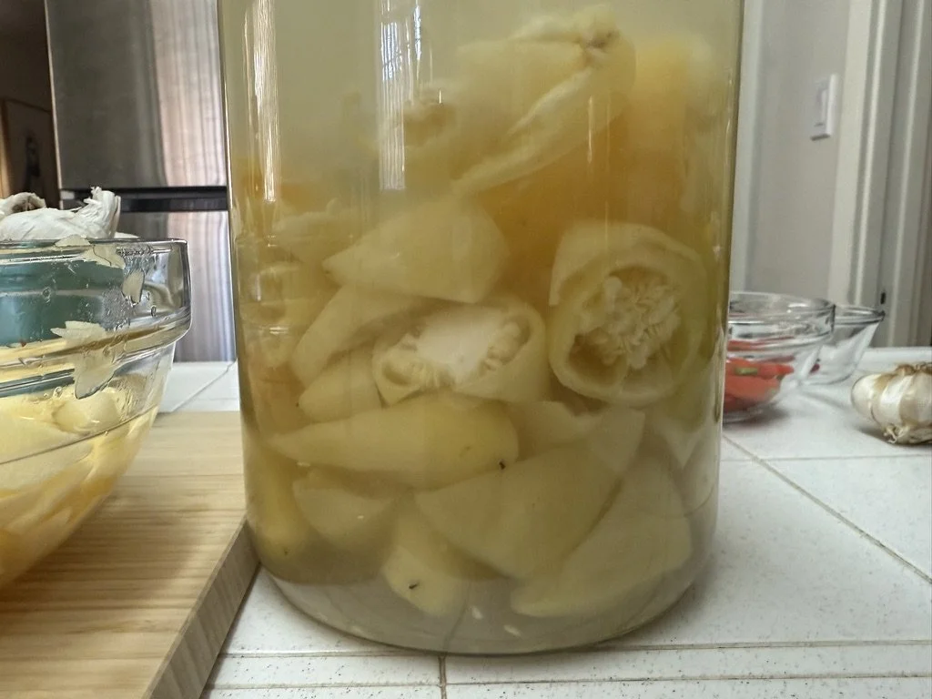 It was the night before Halloween, and I had nearly a gallon of White Chili Peppers that had been fermenting for a few weeks. At this point I had made three hot sauces which had distinct colors and flavors that matched (yellow/orange/red), but I realized I had never seen a ‘white’ hot sauce. So using only white ingredients I tried to make the most bright and uncolored one, and grated fresh Horseradish to aid in heat. When it was all cooked, the spice wasn’t strong enough. My Carolina Reaper plant had just one large ripe pepper, and it was nearly Halloween, so I put it in, cooked, and blended it so as many of the orange/red flakes could survive and permeate but not color the sauce. Acidity was controlled with brown sugar and molasses, and added complexity.